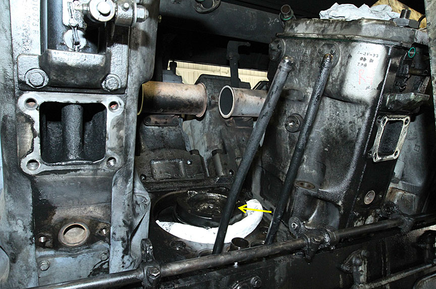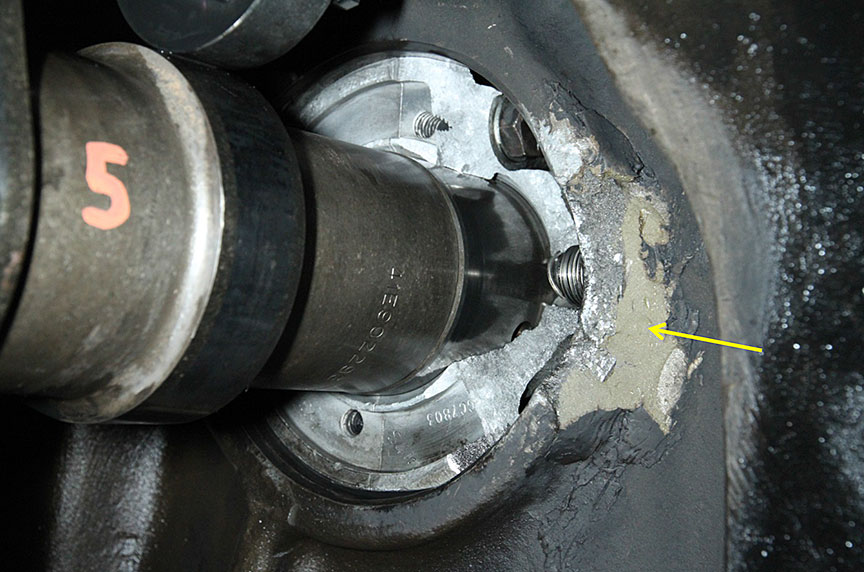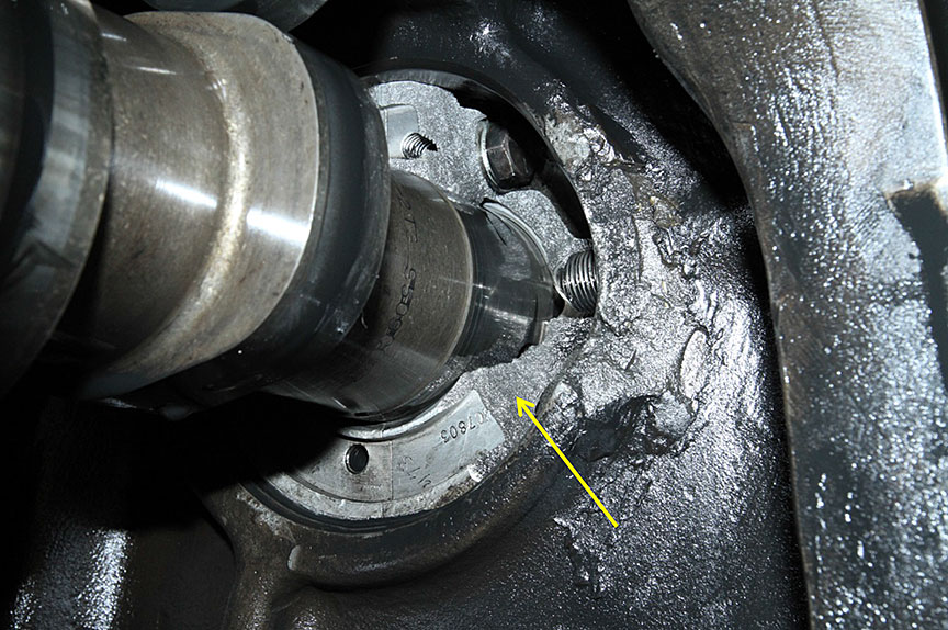 Figure 6. Broken camshaft bearing between PA R4 and R5 (arrowed)