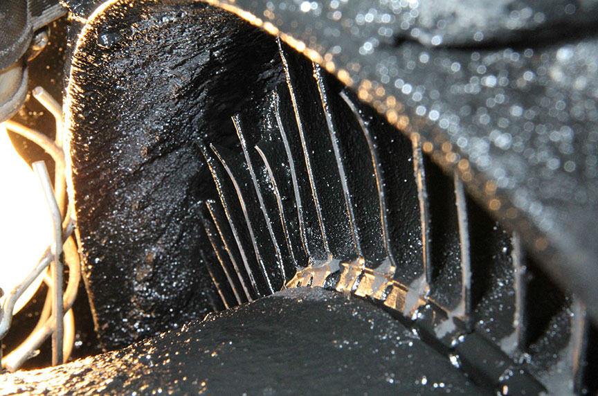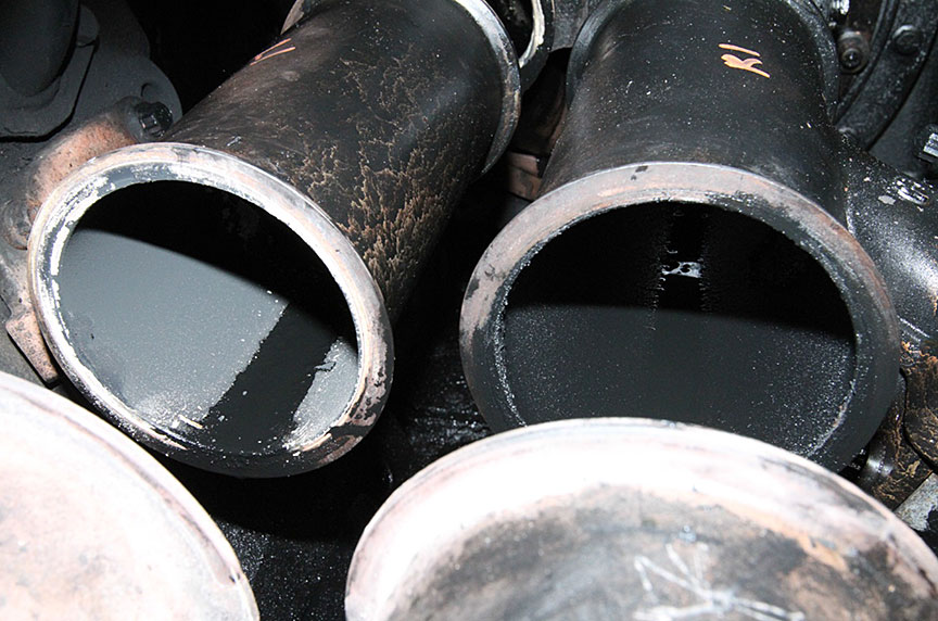 Figure 11. Exhaust manifold bodies for cylinders R8 and L8 showing oil buildup