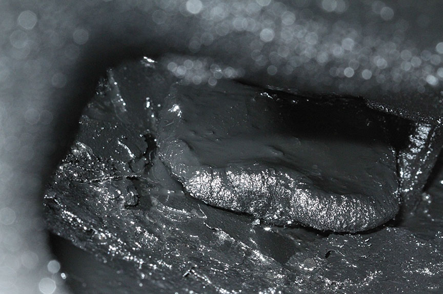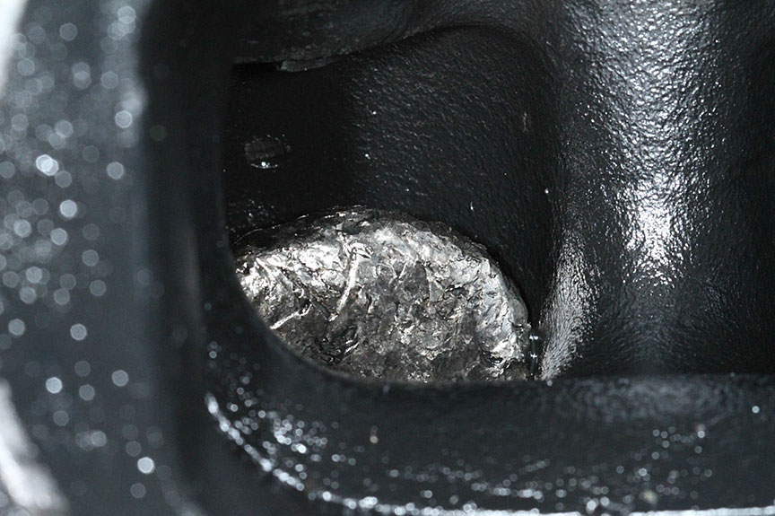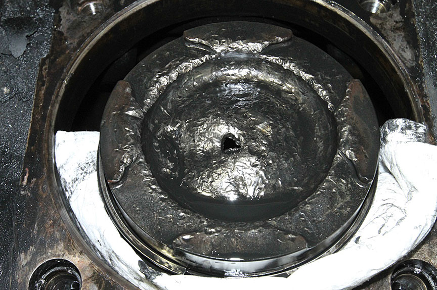 Figure 19. Piston crown of PA R5. Note the valve stem sized hole and oil puddle.