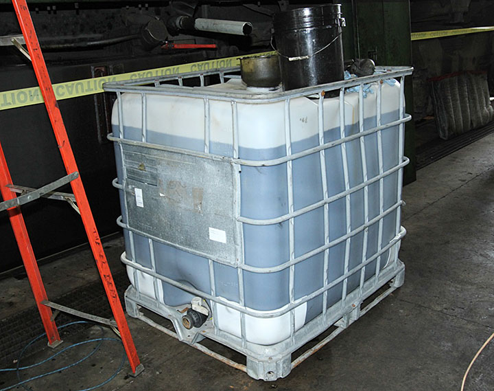 Image of large plastic container to estimate the volume of oil drained from MMA 5017