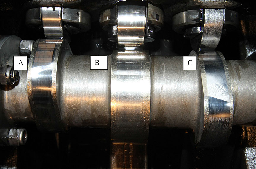 Figure 14. Condition of the intake, fuel injector and exhaust crossheads and cam lobes. The intake (A), fuel injector (B) and exhaust (C) lobes are indicated.