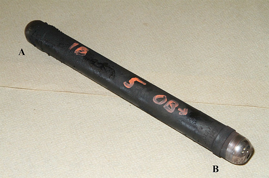 Figure 15. Exhaust crossover pushrod from PA 5. Inboard (A) and outboard (B) ends are labelled.