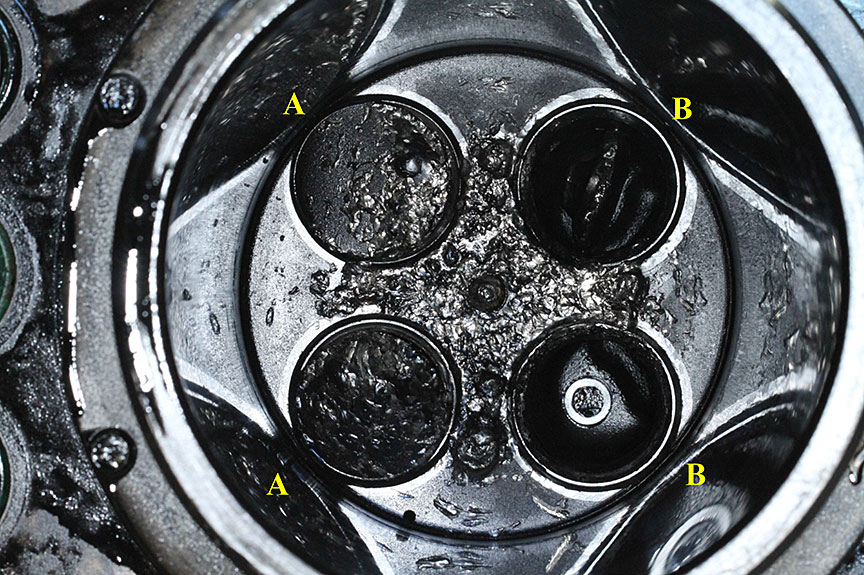 Figure 21. Damage to the combustion chamber of PA R5. The intake (A) and exhaust (B) valves are indicated.