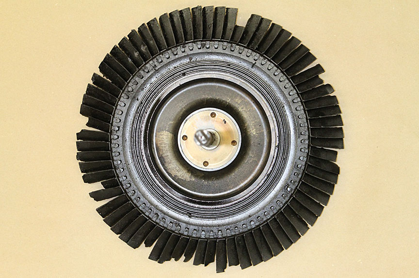 Disassembly of the turbocharger showed that approximately 12 of the 70 turbine blades had fractured (Figure 29). The turbine and compressor journal bearings and shaft showed wear damage, primarily on the compressor side (Figures 30 through 34). The wear areas on both the turbine and compressor bearings occurred in three locations radially around the bore of the bearings, between the three equally spaced oil delivery ports. A large quantity of dense oil sludge was found in the body of the turbocharger indicating that oil had been collecting in the turbocharger for some time. However, the oil seals for both the compressor and turbine bearings were in good condition and there was no sign of abnormal leakage (Figure 35).