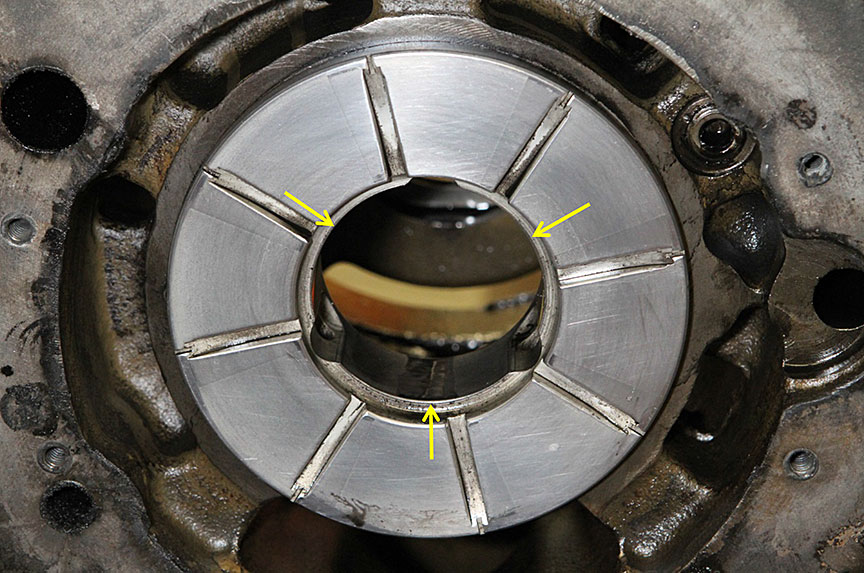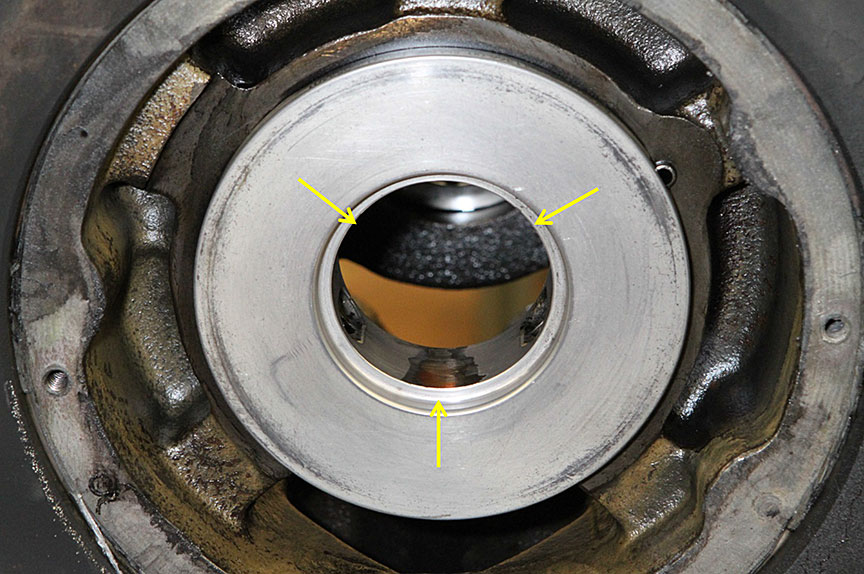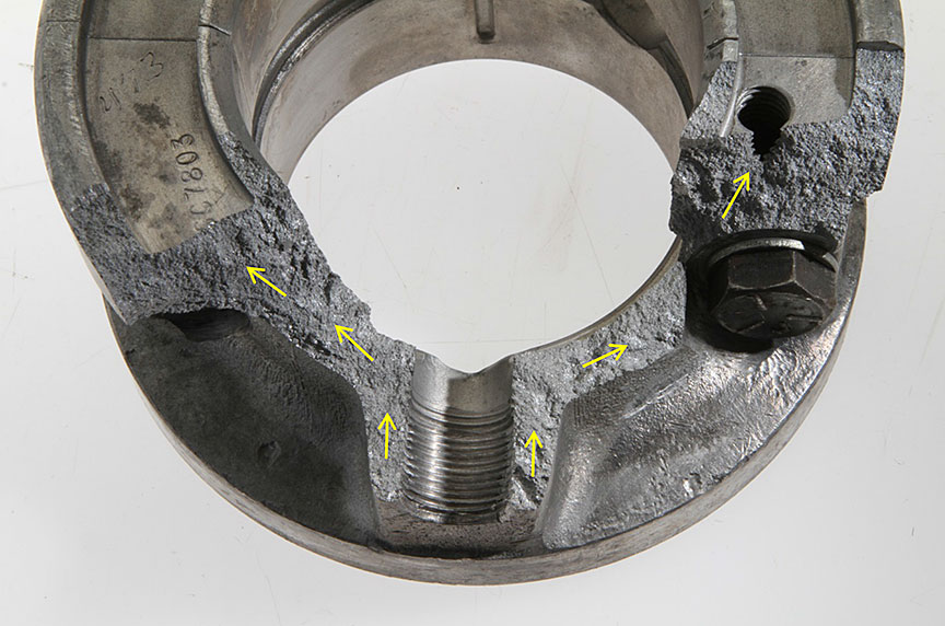 Figure 39. Substitute bearing in R4/R5 position showing unsupported bearing area (arrowed).