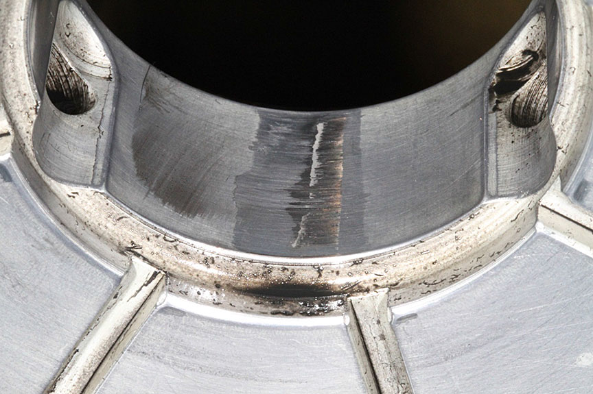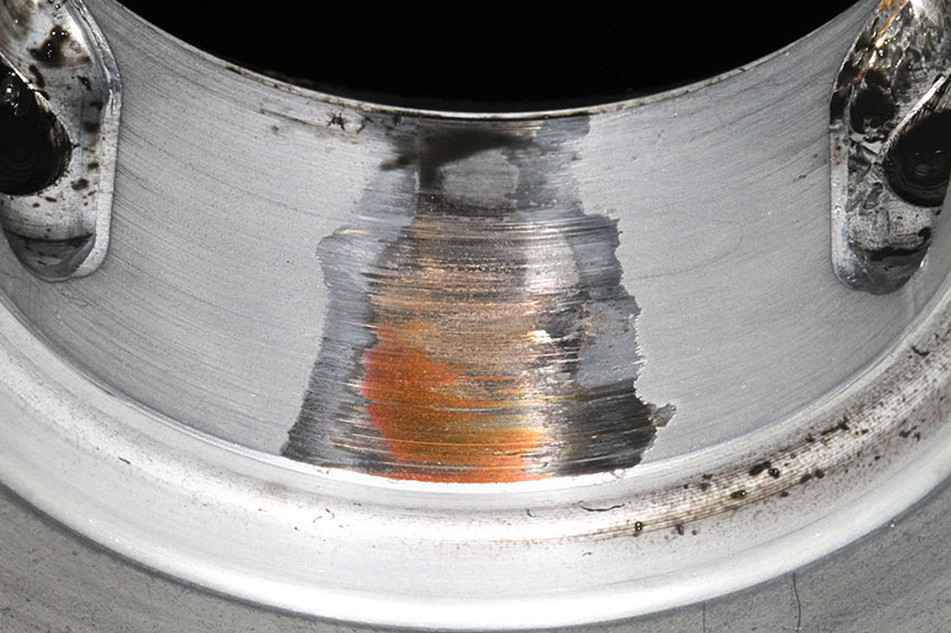Image of turbocharger shaft showing heat damage at compressor bearing journal