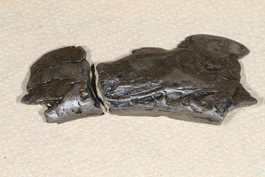 Figure 40. Recovered polymeric material pieces refitted showing extent of repair (arrowed).