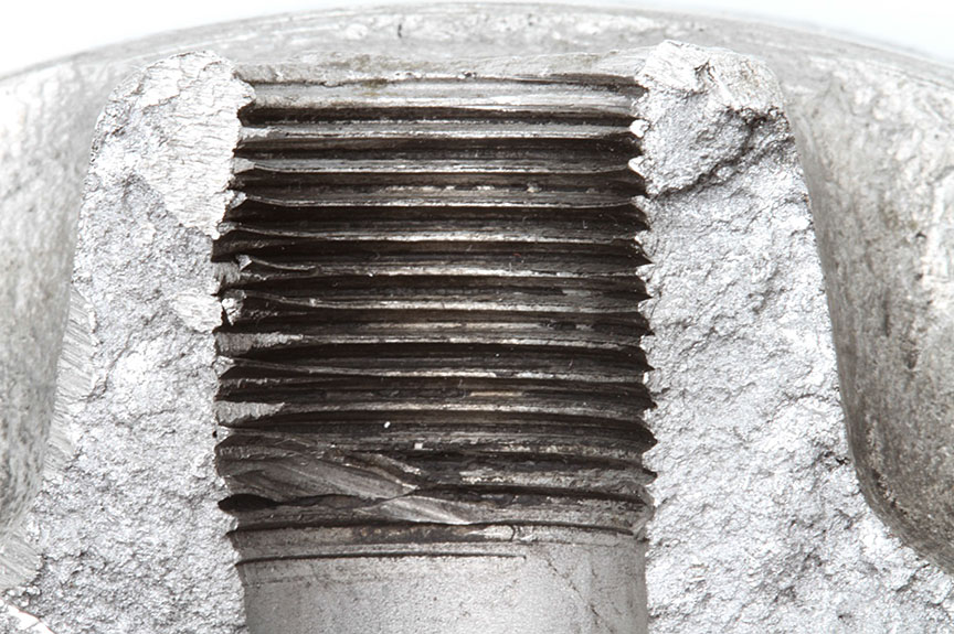 Figure 44. Mounting bolt thread damage in separated portion of cam bearing. Note the thread damage is localized at the fracture edges.