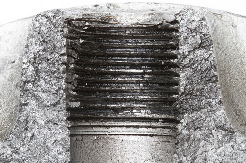 Figure 47. Mounting bolt thread damage in remaining portion of cam bearing. Note the thread damage is localized at the fracture edges.