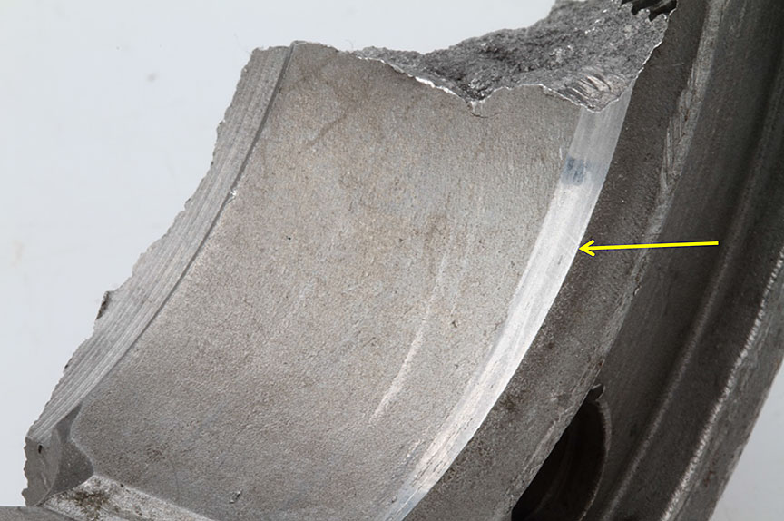 Figure 49. Smear on outboard edge of separated cam bearing portion (arrowed).