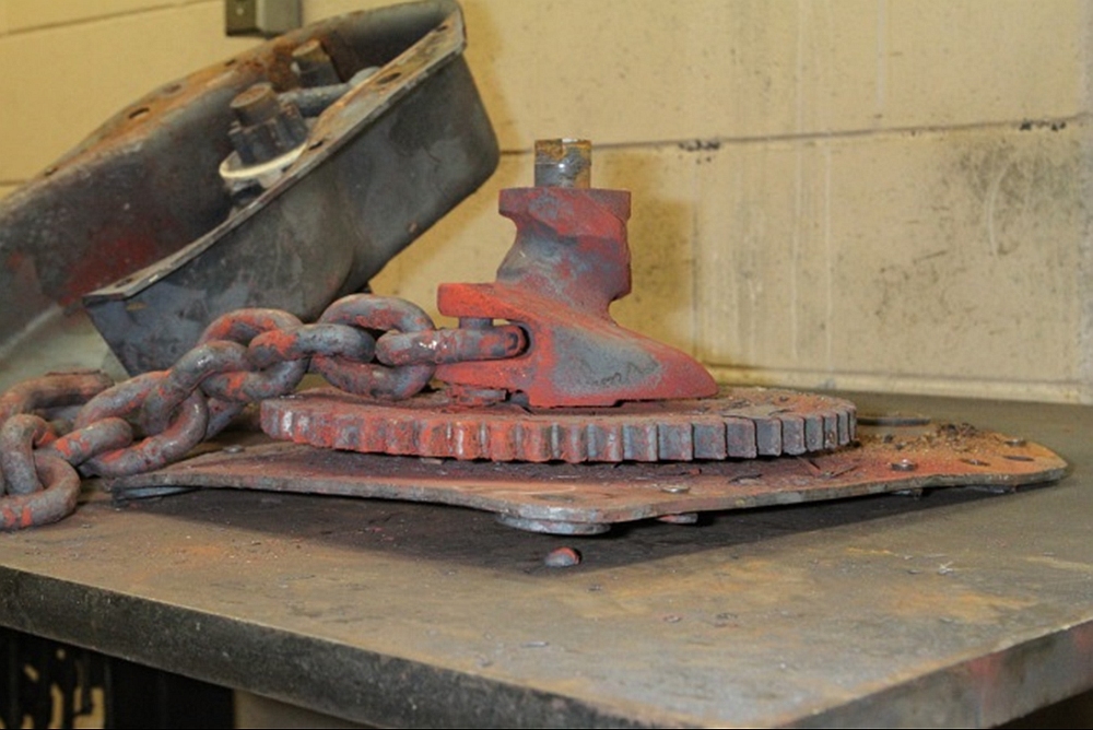 The three handbrakes were photographed as received before examination (Figure 1). The handwheels from handbrakes 1 and 2 had been previously removed prior to shipping to the TSB laboratory but were temporarily replaced for the photographs. It is not known whether the handbrakes had been operated following the occurrence. The three handbrakes were in the released position with the upper chain attachment point clearly visible. White paint residue was visible at the upper chain attachment point on all the handbrakes although mostly removed due to fire damage on number one (Figure 2). The back plate of handbrake number 1 showed deformation (Figure 3) whereas the other two did not. The handwheel and release handle were removed from each handbrake. The nut used to secure the release handle had been welded to its shaft in each case and had to be cut before removal. The heads of the solid rivets used to join the front housing to the back plate were cut using an abrasive disc and the housing was lifted off (Figure 4).