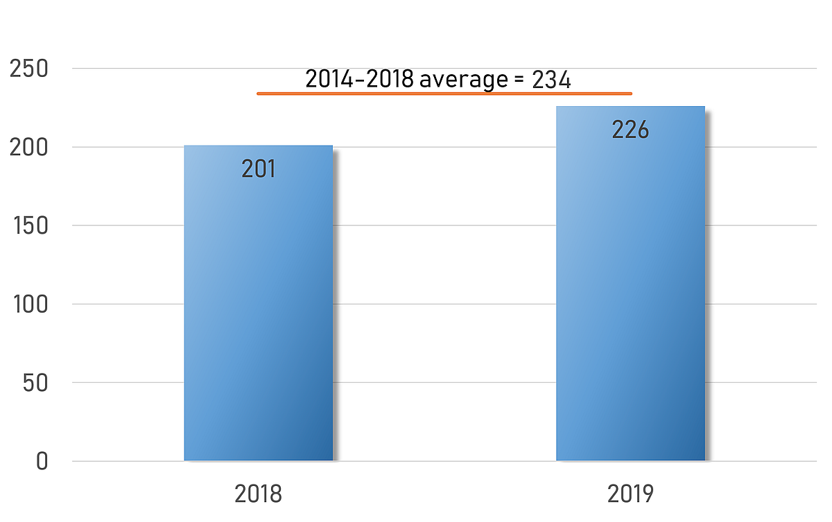 There were 72 rail-related fatalities reported in 2019, 15 more than the previous year and well above the 5-year average of 60. Among the 2019 fatalities, 38 involved trespassers, compared with 34 in 2018 and the 5-year average of 39. Crossing accident fatalities increased substantially in 2019 (28) from 2018 (19) and from the 5-year average (19). To better understand these data, the TSB will examine underlying factors for crossing accidents.