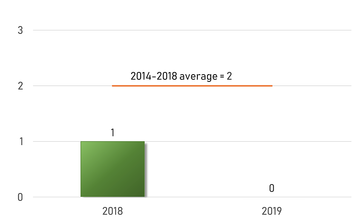 There were no pipeline accidents in 2019. There were 47 pipeline incidents, for a total of 47 pipeline occurrences reported to the TSB in 2019, well below the total of 110 in 2018 and the 5-year average of 111. The number of pipeline occurrences involving a release of product was substantially lower in 2019 than in previous years (20 in 2019 compared with 41 in 2018 and the 5-year average of 62). Sixteen of the 20 occurrences in the “Product released” category in 2019 involved a release of hydrocarbon gas.