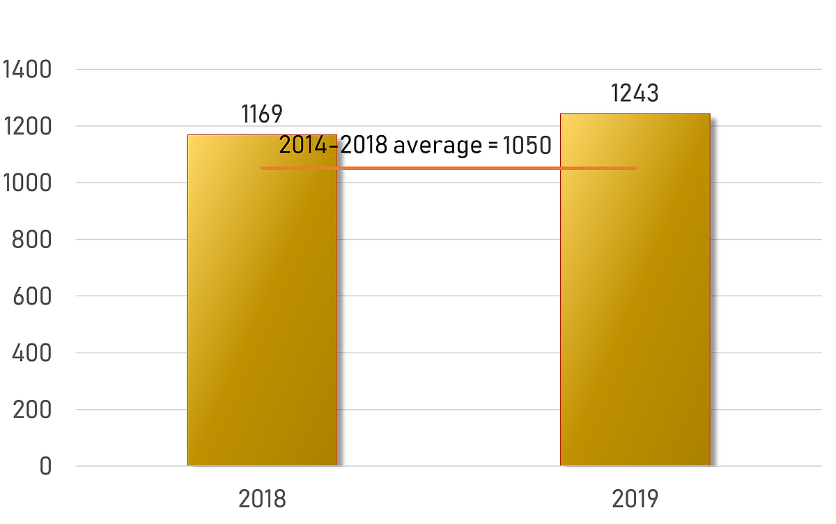Overall, 1243 railway accidents were reported to the TSB in 2019, which is an 18% increase from the 5-year average of 1050.