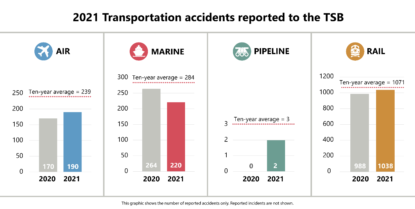 Building on the preliminary statistics published in February 2022, the Transportation Safety Board of Canada (TSB) today released its 2021 final annual statistical summaries on transportation occurrences in the air, marine, pipeline, and rail transportation sectors.