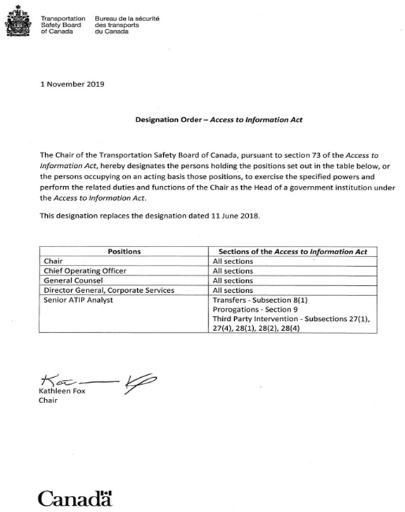 As required by the legislation, a delegation of authority is in place. For the purposes of the Access to Information Act, the “head of the institution” as defined in section 3 of the Act is the Chair of the TSB. The incumbents of the positions of General Counsel, Chief Operating Officer, Director General for Corporate Services and Senior ATIP Analyst have been delegated powers by the Chair deemed appropriate for the effective administration of the Act. These employees ensure that the TSB meets all its obligations fairly and consistently. The delegation of authority was updated in November 2019 and remains unchanged. A copy of the Delegation Order is attached as Appendix A.