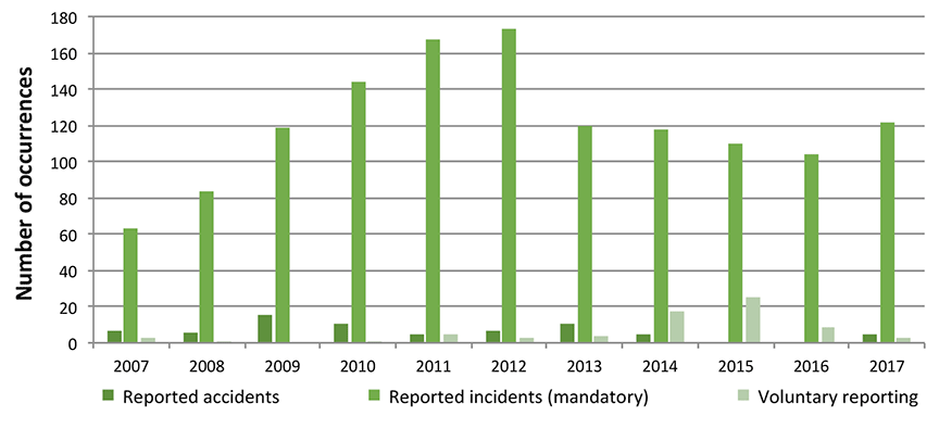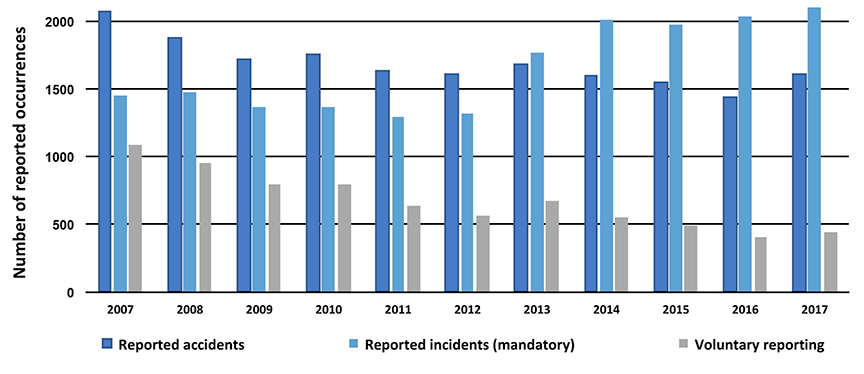 After a consistent downward trend since 2013, the overall number of occurrences reported rose in 2017, despite improvements in some sectors.Footnote 1 In 2017, 1,614 accidents and 2,210 incidents were reported in accordance with the TSB's regulations for mandatory reporting of occurrences (Figure 2).Footnote 2
