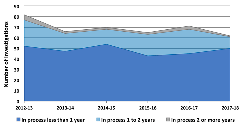 Figure 4 depicts the number of investigations in process as of 31 March for the past six fiscal years based on how long the investigation file had been open. The increase in investigations in process for less than a year in 2017-18, and the corresponding decrease in those in process for longer, illustrate the results of the TSB's efforts to improve investigation timeliness.