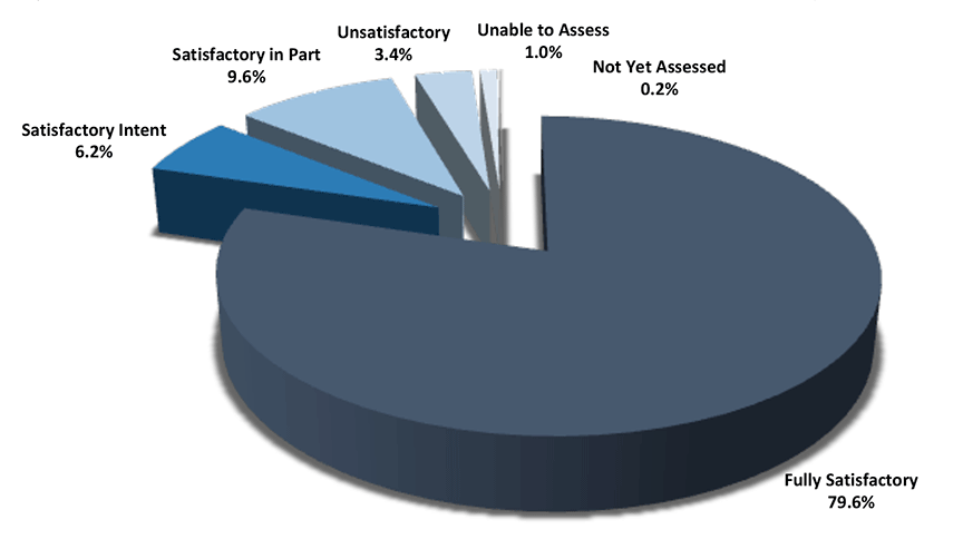The Board had assessed another 6.2% of the responses as Satisfactory Intent. This indicates that change agents were taking or had planned to take action that, when fully implemented, would substantially reduce the safety deficiencies. In 9.6% of cases, the Board had issued a rating of Satisfactory in Part, which means that change agents were taking or had planned to take action that would not substantially reduce or eliminate the deficiencies. The Board had assessed 3.4% of responses as Unsatisfactory, since change agents had not taken or were not planning to take action that would address the deficiencies, or the planned action was taking too long. In the remaining cases, the Board had received insufficient information to be able to assess the response, or the recommendations were too new and had yet to be assessed.