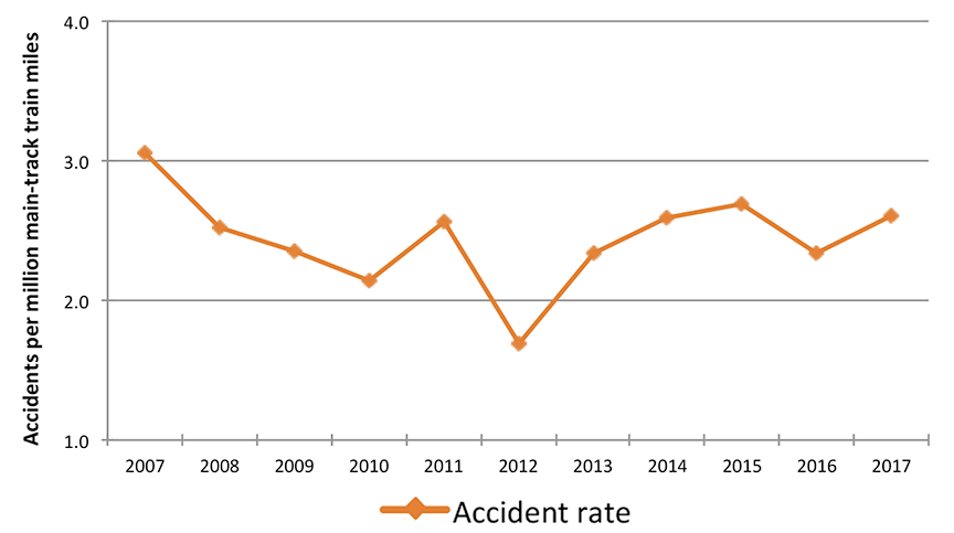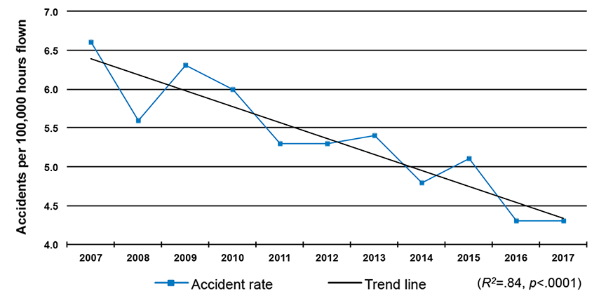 The 1,614 accidents reported in 2017 represented a 12% increase from the 1,437 reported in 2016. However, the 2017 total was 5% lower than the 10-year average of 1,694. There were 120 fatalities in 2017, up 2% from the 2016 total of 118, but 19% below the 10-year average of 149.
