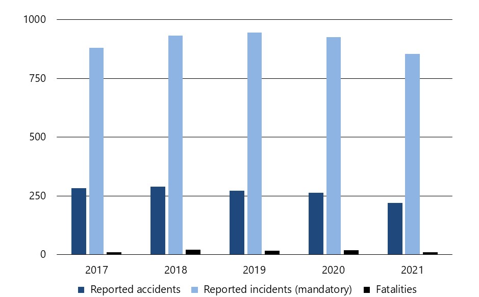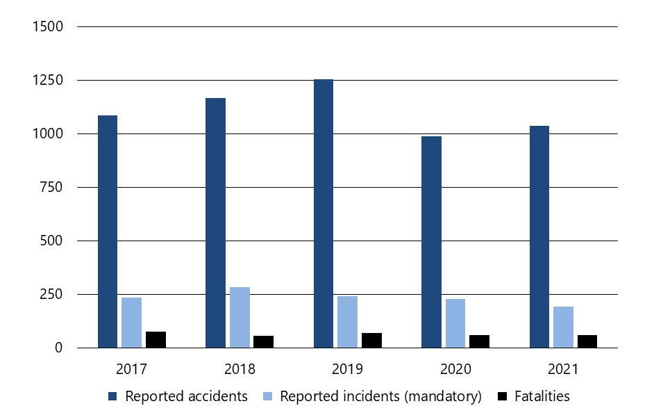 In 2021, there were 1450 accidents reported, 2% above the 2020 total of 1422, but 9% below the 10-year average of 1597.