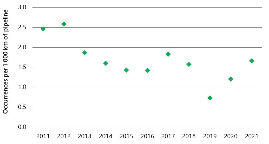 The total of 1661 incidents reported to the TSB in 2021 is almost unchanged from the 2020 total of 1658, and a 10% decrease from the 10-year average of 1853. The latter partly results from changes made in 2014 to TSB reporting requirements.