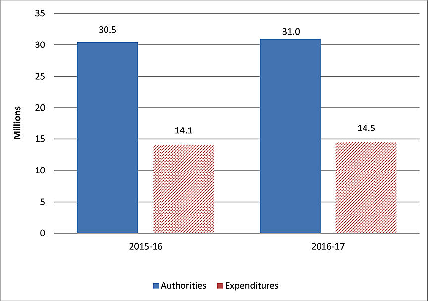 TSB's total authorities available for use increased by $437,000 between fiscal years 2015-16 and 2016-17. This increase is explained mainly by a higher OBCF of $398,000 and an $81,000 increase in Employee Benefit Plan percentage, which is set annually by Treasury Board Secretariat. There was also an increase of $13,000 due to higher respendable revenues earned, which is offset by two government-wide budget reductions: Treasury Board Secretariat Back Office Transformation ($32,000 in second quarter) and Canada School of Public Service Initiative ($23,000 reduced from Main Estimates at beginning of the year).