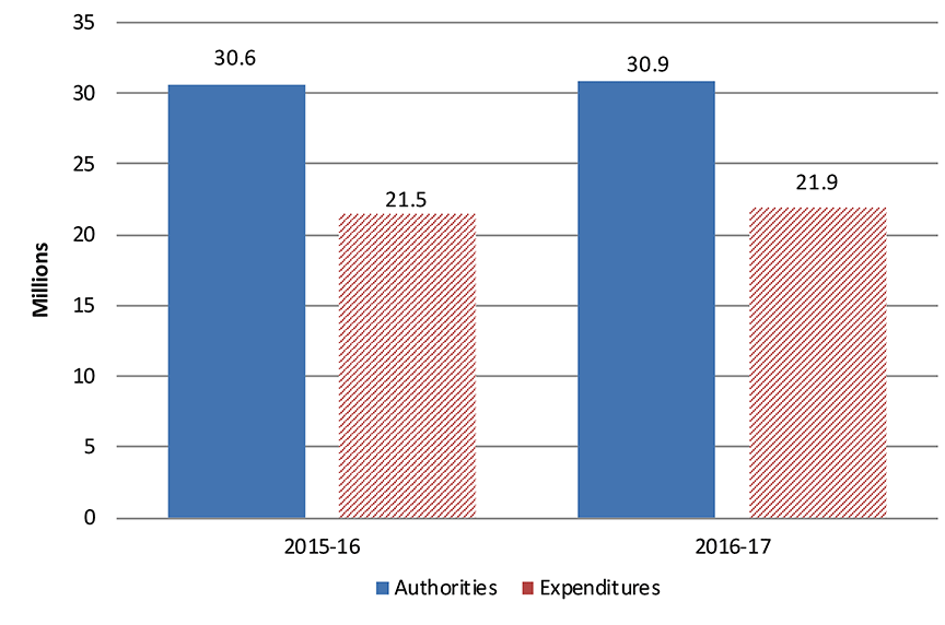 TSB's total authorities available for use increased by $348,000 between fiscal years 2015-16 and 2016-17. This difference is due to a higher OBCF of $398,000 and an $81,000 increase in Employee Benefit Plan percentage, which is set annually by Treasury Board Secretariat. These increases are offset by the two government-wide budget reductions described above totaling $97,000 as well as an additional reduction for the Canada School of Public Service Initiative ($23,000 reduced from Main Estimates at beginning of the year). There were also lower respendable revenues earned this year, representing a further decrease in authorities of $11,000.