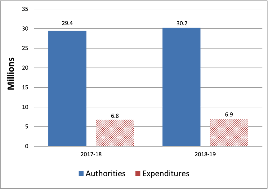 The TSB’s total authorities available for use increased by $780,000 between fiscal years 2018-19 and 2017-18. This variance is primarily explained by increased funding of $760,000 provided by the Treasury Board Secretariat to cover a portion of the negotiated salary increases resulting from the last round of collective bargaining. The remaining difference is mainly due to fluctuations in the Employee Benefit Plan (EBP) percentage, which is a rate set annually by the Treasury Board Secretariat.