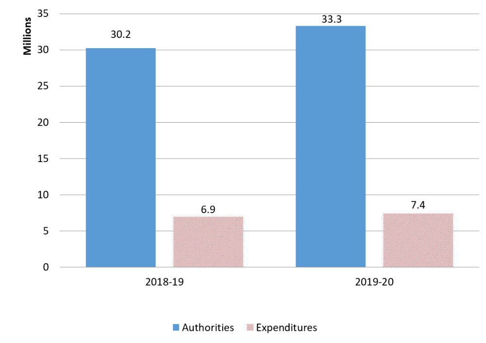 The TSB’s total authorities available for use increased by $3,072,000 between fiscal years 2019-20 and 2018-19. The majority of this difference is due to an increase in permanent funding of $2,978,000 allocated to the TSB in the third quarter of 2018-19. This amount was obtained through a Treasury Board Submission in response to the TSB’s program integrity funding pressures. The remaining increase is attributed to compensation adjustments for signed collective agreements, which is offset by adjustments to the Employee Benefit Plan (EBP) percentage. This EBP percentage fluctuates from year to year and is a rate set annually by the Treasury Board Secretariat.