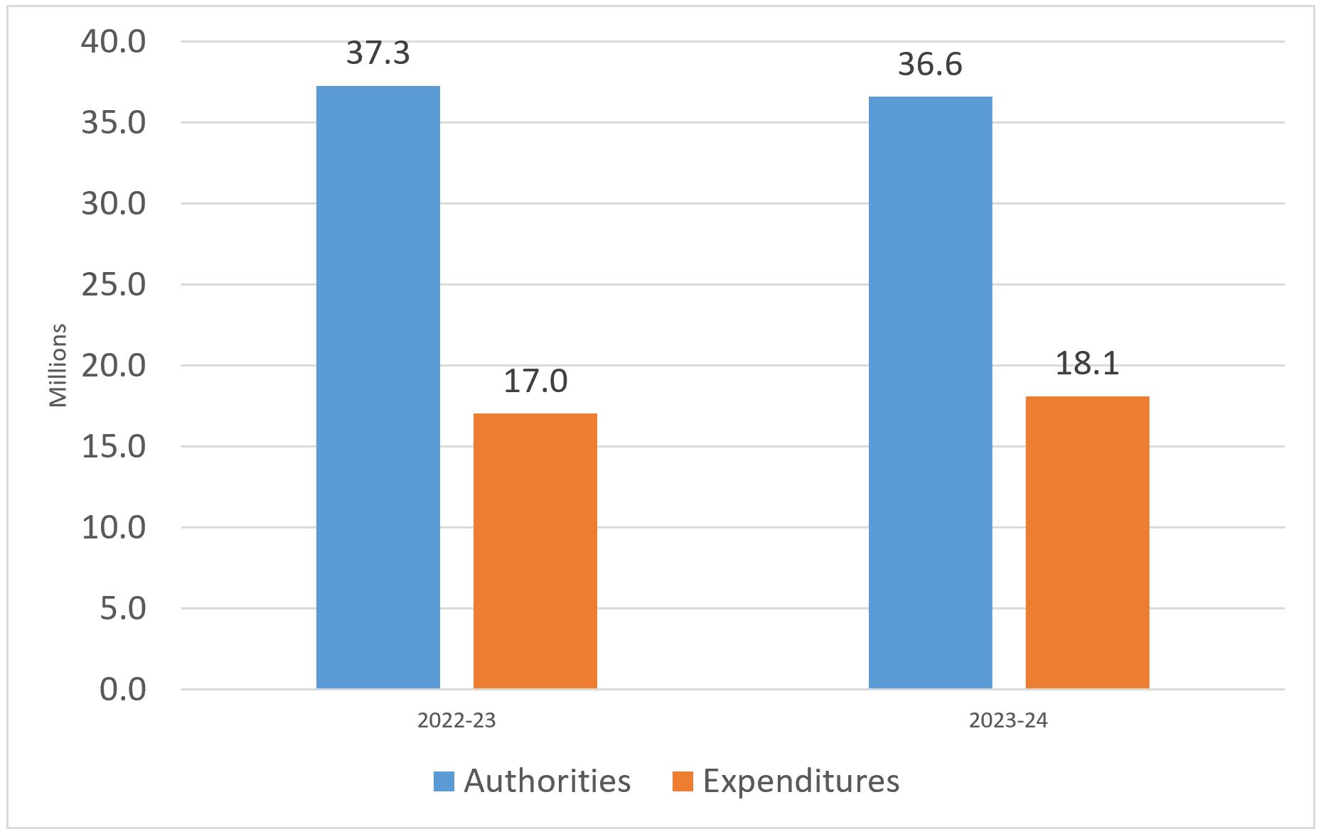 The TSB’s total authorities available for use decreased by $674,000 between fiscal years 2023-24 and 2022-23. This variance is primarily explained by the Laboratories Canada program funding of $615,000 that was received in 2022-23 but was not received for the current fiscal year.  For 2023-24, a new funding structure was agreed upon whereby the TSB would not receive upfront authorities for the Laboratories Canada program, but rather a reimbursement of expenditures. The remaining difference is mainly due to fluctuations in the Employee Benefit Plan (EBP) percentage, which is a rate set annually by the Treasury Board Secretariat.