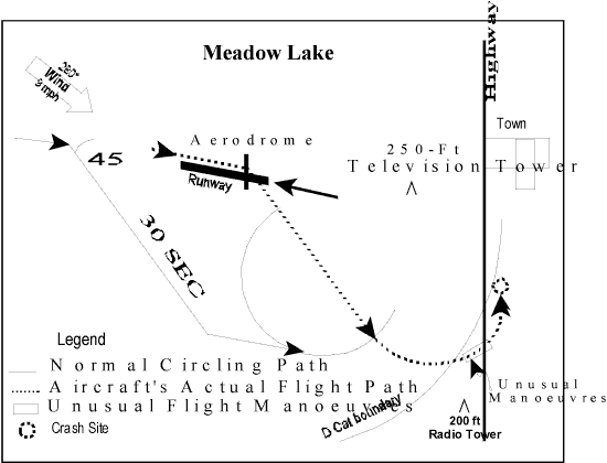 The circling approach procedure that the crew had practiced during the latest simulator training session is similar to the one depicted by the solid flight-path-line in figure 2. That procedure is consistent with standard circling procedures depicted in the AIP and the Transport Canada Instrument Flight Procedures Manual (TP 2076E). However, on the day of the accident, the aircraft began the circling procedure overhead the aerodrome and followed the flight path indicated by the dotted line on figure 2. That flight path took the aircraft outside the category D obstacle clearance area and into the vicinity of the 200-foot high radio tower. The abrupt rolling manoeuvres that were observed by ground witnesses occurred as the aircraft was approaching the northbound highway which leads into the town of Meadow Lake. These witness accounts indicate that the event was of short duration and involved several steep-banked attitudes in both directions. Based on one witness's description of the aircraft's nose movement to the left while it was established in a steep right-banked attitude, it is possible that the aircraft was also subjected to a negative g force.