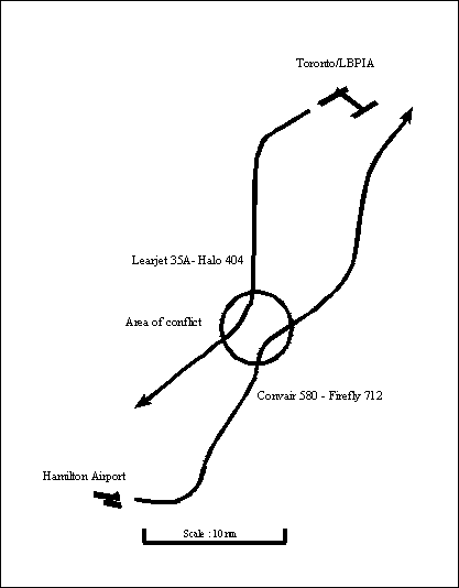 The Toronto Terminal Specialty is responsible for that airspace within a 26 nm radius of the Toronto very high frequency omni-directional range (VOR), from the ground up to and including flight level 230 (FL230). The departure airspace in the area of the occurrence is capped at 7,000 feet asl. Procedures at the Toronto Area Control Centre (ACC) stipulate that Terminal will clear all aircraft landing at Hamilton direct to the Bravo non-directional beacon (NDB) at an altitude determined by the active runway at LBPIA. When LBPIA arrivals are on runways 24L/R, 15 or 33 (as was the case on the day of the occurrence), Hamilton arrivals will be at 6,000 feet asl. It further states that, for Hamilton departures eastbound, the Hamilton controller shall clear this traffic to 5,000 feet asl and hand-off to South Departure.