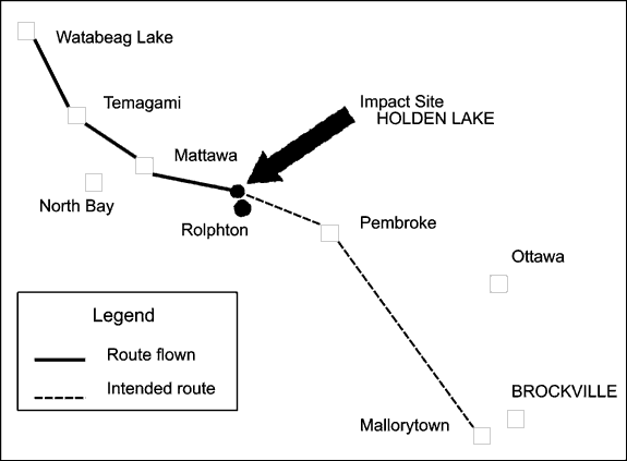 The pilot had intended to stop at Temagami, then proceed along the Ottawa River via Mattawa, Pembroke, and Golden Lake, to his destination of Mallo village located south of Brockville. The aircraft was seen during a stopover at Temagami. When the aircraft took off from Temagami, weather conditions were favourable for VFR flight. It could not be determined whether the aircraft landed anywhere else en route.