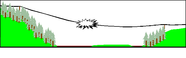 The power line was suspended from poles on either side of the river. Both of the supporting poles were surrounded by tall evergreen foliage and dense deciduous trees, and the cut-line normally associated with hydro lines had been overgrown with vegetation.