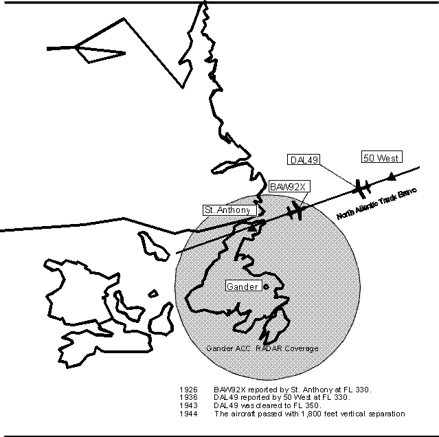 DAL49 passed about 1,800 feet above and one mile south of BAW92X, where the required separation was 2,000 feet vertically. The two aircraft had been closing at a combined speed of 980 knots, and at 30 miles were less than two minutes apart. The occurrence took place at 52°25′N, 52°40′W at approximately 1944, during daylight hours. (See Appendix A.)