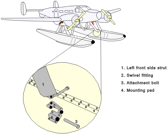 Examination of the aircraft after the occurrence revealed that the left float's front and rear vertical struts were still attached to the float, but their top fittings (at the aircraft nacelle) were twisted and showed signs of overload failure. The eyebolt fitting of the diagonal side strut failed at the swivel fitting where it attaches to the float. The rear side strut upper attachment bolt at the fuselage was twisted, and the rear swivel fitting bolt, by which the swivel and the diagonal strut are attached to the rear float mount pad, was broken. The mounting pad on the float showed signs of metal smearing. The front side strut was still attached to the fuselage; the attaching bolt was in place and the fitting showed little damage. The float end of the front side strut incorporates a swivel fitting, which attaches to a mounting pad on the float. Neither the front left swivel fitting nor the corresponding mounting pad showed evidence of damage or distortion; the mounting bolt and nut were not recovered.