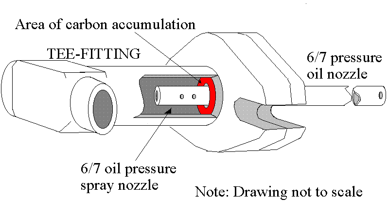 - The design of the tee-fitting and standpipe assembly is conducive to the formation of carbon in an area between the inner wall of the tee-fitting and the 6/7 bearing pressure oil nozzle.