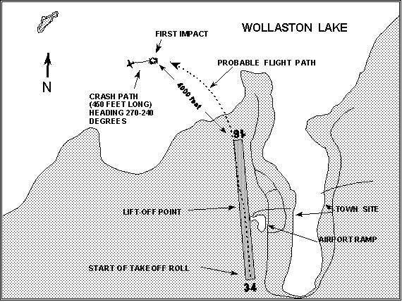Footnote 1 Footnote 2The aircraft was observed to climb at an unusually shallow angle after take-off, and, when efforts by company personnel to reach the pilot by radio were unsuccessful, a ground search was commenced. The aircraft was found about five minutes after the accident, located on the ice- and snow-covered surface of Wollaston Lake, about 0.75 nautical miles (nm) from the departure end of the runway, and about 1.3 nm from the point of commencement of the take-off rollFootnote 3.