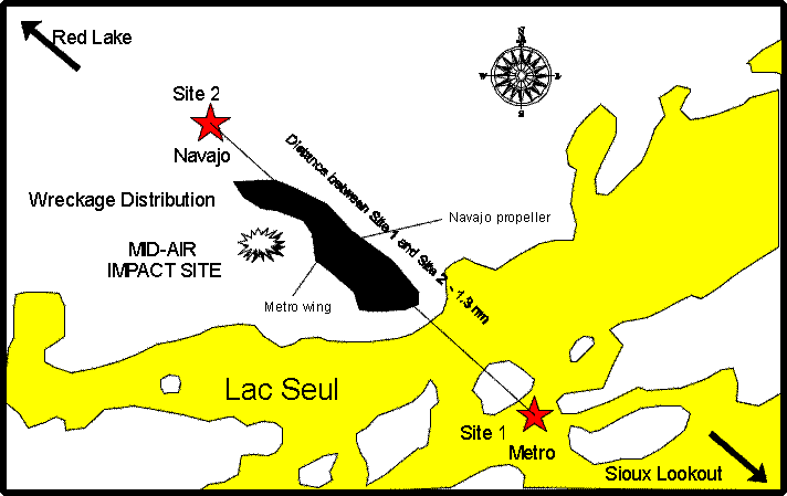 Air Sandy flight 3101, a Piper PA-31 Navajo with one pilot and four passengers on board, had departed Sioux Lookout on a flight to Red Lake, Ontario. Bearskin Airlines flight 362, a Fairchild Swearingen Metro 23 with a crew of two and one passenger on board, was inbound to Sioux Lookout on a flight from Red Lake. The two aircraft collided at 4,500 feet above sea level, approximately 12 nautical miles northwest of Sioux Lookout. All eight occupants were fatally injured.