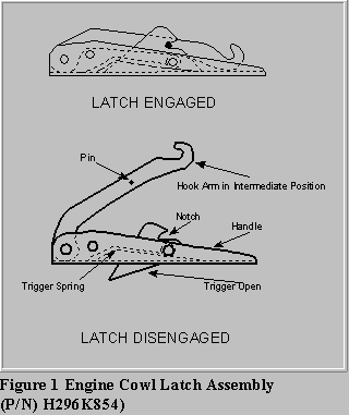 Both the H296K854 latches and the H296K1135 latches are an overcentre toggle-type latch. The primary locking action is due to tensile loading and the toggle effect between the handle and the hook arm. The edges of the trigger are notched pawls that engage pins on the hook arm to act as a secondary locking device. The top of the trigger must be pushed to release the latch. The trigger is retained in the closed position by a spring. The trigger hinge is set toward the top of the trigger. A pressure differential between the inside and outside of the cowling will tend to open the trigger if the pressure is great enough to overcome the spring and friction resistance. Light tensile loading on the hook will permit the handle to open if the trigger releases.