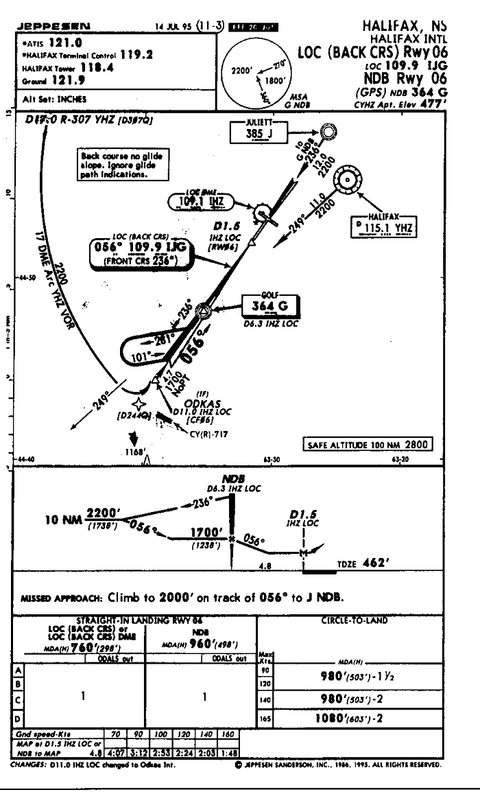 The CAP non-precision localizer back course approach to runway 06 at Halifax has a beacon crossing altitude of 1,700 feet asl over the Golf NDB, final approach fix, with a minimum descent altitude (MDA) of 760 feet asl or 298 feet agl. The touchdown zone elevation is 462 feet asl. The Jeppesen approach plates used by CAI use the same altitudes as the CAP approach plates.