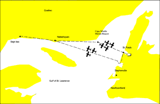 The four aircraft departed Sept-Îles at 1600 UTC, arriving at Natashquan at 1741 UTC. The weather at Natashquan was sunny and warm with good visibility. At about 1839 UTC, after refuelling, the four aircraft departed Natashquan on a flight-planned route via the "whiskey" non-directional beacon at Cape Whittle, Quebec, direct Cow Head, Newfoundland. Each pilot had a VFR navigation chart on board and a personal global positioning system computer for navigating.