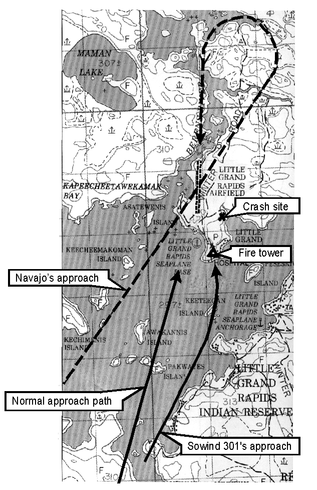 After the aircraft had climbed back above the cloud layer, a second Sowind Air Ltd. aircraft, a PA31-350 Navajo, Flight 318, arrived in the vicinity of Little Grand Rapids, operating under VFR. The Navajo pilot reported that he flew over the airport from the southwest at a height of about 300 feet agl, turned, and made a successful landing on runway 18. He then advised the Bandeirante crew by radio that the visibility on final for runway 18 was two miles and that he was on the ground. The Navajo was clearly seen, by witnesses, over the lake to the south of the runway. The approach flown by the Navajo was described as west of the normal approach path to runway 36, but conforming to about the altitude usually observed.Footnote 4 The Navajo was observed flying over the runway at low level before turning for an approach to runway 18. One witness described the Navajo as appearing as a vague outline; another observer stated that the Navajo appeared to "pop out" over the runway.