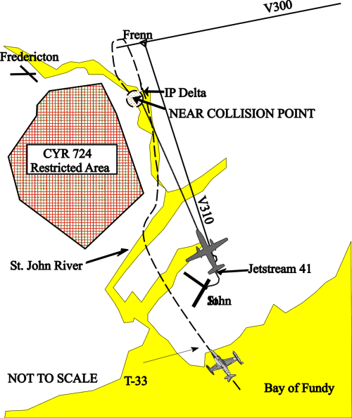 Air Atlantic Flight 427, a Jetstream 41, had departed Saint John, New Brunswick, and was approaching Fredericton from the south-east along the Saint John River. Pirate 61, a military T-33 jet aircraft engaged in a military training exercise, was established in a holding pattern along the Saint John river. A risk of collision occurred when the two aircraft passed within 100 feet of one another.