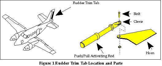 The rudder trim is set by turning a wheel in the cockpit. This movement is converted into a fore and aft motion of the push/pull rod. The rod, attached by a clevis and bolt to a horn on the starboard side of the rudder trim tab, displaces the tab either to the left or right. This causes the rudder to be moved in the opposite direction thereby trimming out the control forces necessary to maintain co-ordinated flight. (See Figure 1)