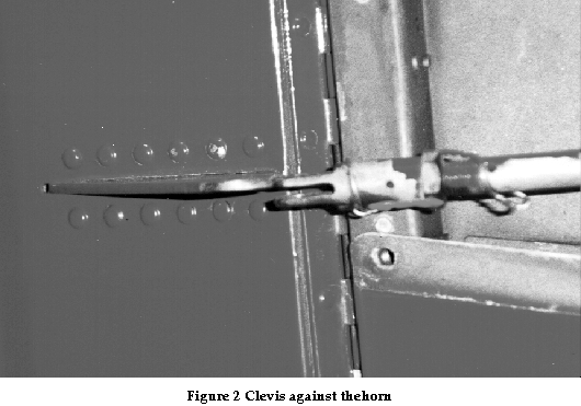 When the crew finally regained control of the aircraft they noted that 2/3 rudder was required to maintain co-ordinated flight. If the push/pull actuating rod moves slightly up or down and inward toward the aircraft body, the arms of the clevis can end-butt against the horn (see Figure 2) and force the tab to the left. If this occurred, the rudder would be displaced to the right requiring left rudder input to maintain co-ordinated flight. Tests on another King Air showed that when the rod is in this position the trim tab would be displaced approximately half its maximum deflection if the trim tab control started in the neutral position. The air stream would be sufficient to hold the tab horn firmly against the clevis unless another buzz was introduced. These tests also showed that this was a fairly stable position for the clevis that would not shift with control inputs or minor vibration.