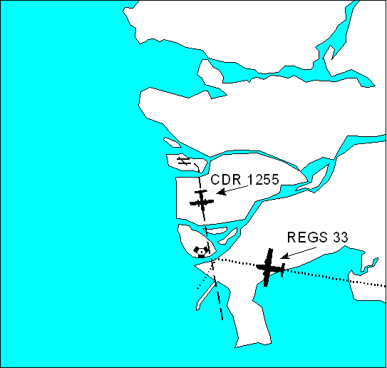 The Canadian Regional DHC-8 was on a scheduled IFR flight from Vancouver to Victoria, via the Vancouver VORTAC and the "DUNCN THREE" arrival procedure, with a flight-planned true airspeed of 236 knots. Shortly after take-off, and while heading 140 ° magnetic, the aircraft was cleared to maintain 4,000 feet asl. At that time, the two aircraft were on converging tracks and had been cleared to the same altitude. When the aircraft first appeared on the controller's indicator module, they were about 16 nm apart. At 1643, when the aircraft were 3 nm and 400 feet apart, a loss of separation occurred. The Vancouver departure controller realized that the two aircraft were in conflict moments before the loss of separation occurred, and he immediately instructed REGS 33 to turn left to 170 °, and CDR 1255 to descend to 3,000 feet asl. Although these instructions began to correct the conflict, the spacing between the aircraft was reduced to 0.75 nm and 400 feet.