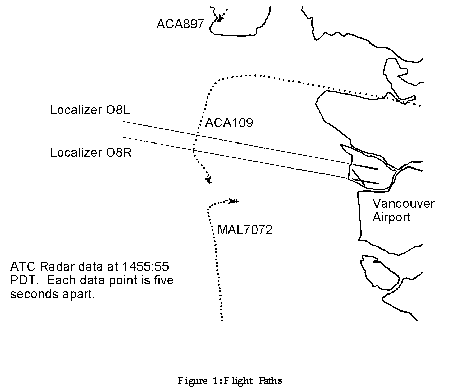 In the five minutes leading up to the loss of separation, the Boeing 767 (ACA109) was north-east of Vancouver, inbound from Toronto, and was carrying out the BOOTH FOUR standard terminal arrival procedure (STAR) leading to an ILS approach to runway 08 Left (L). At the same time, the Boeing 747 (ACA897) was north of Vancouver, inbound from London, U.K., also for runway 08L. The Cessna 208 (MAL7072) was to the south on the V338 airway, arriving from Victoria, heading for runway 08 Right (R).