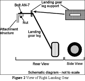 Figure 2 is a schematic of the installation of a landing gear leg on the Cessna 185. When the leg is not on the ground, the bolt is under tension, and at other times it serves as a locator to hold the assembly in position. On the right side of the aircraft, the upper part of the landing gear leg support bracket was torn away and the outboard lower part showed evidence of compression. The cabin floor area above the ski attachment angle was punctured by the tip of the landing gear leg. There is a hole to insert bolt AN-7 in the attachment angle. The interior surface of this bolt hole shows clear thread imprints on the inboard side. The number of threads matches that observed when the nut is engaged up to the fibre locking portion. The lower part of the attachment angle showed hexagonal imprints consistent with the shape of the nut. These nut and thread imprints were not observed on the left landing gear attachment angle.